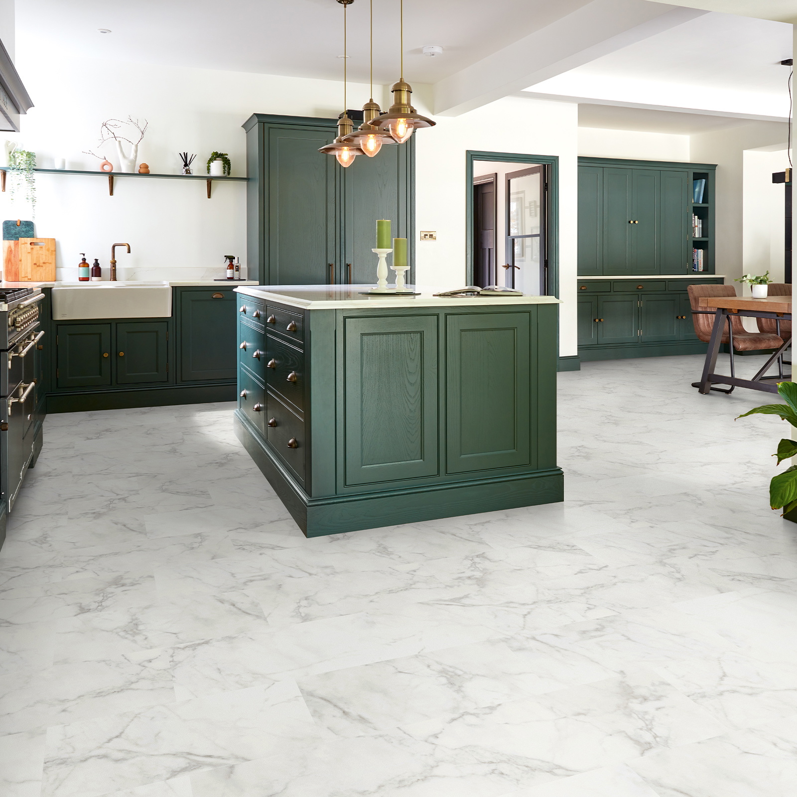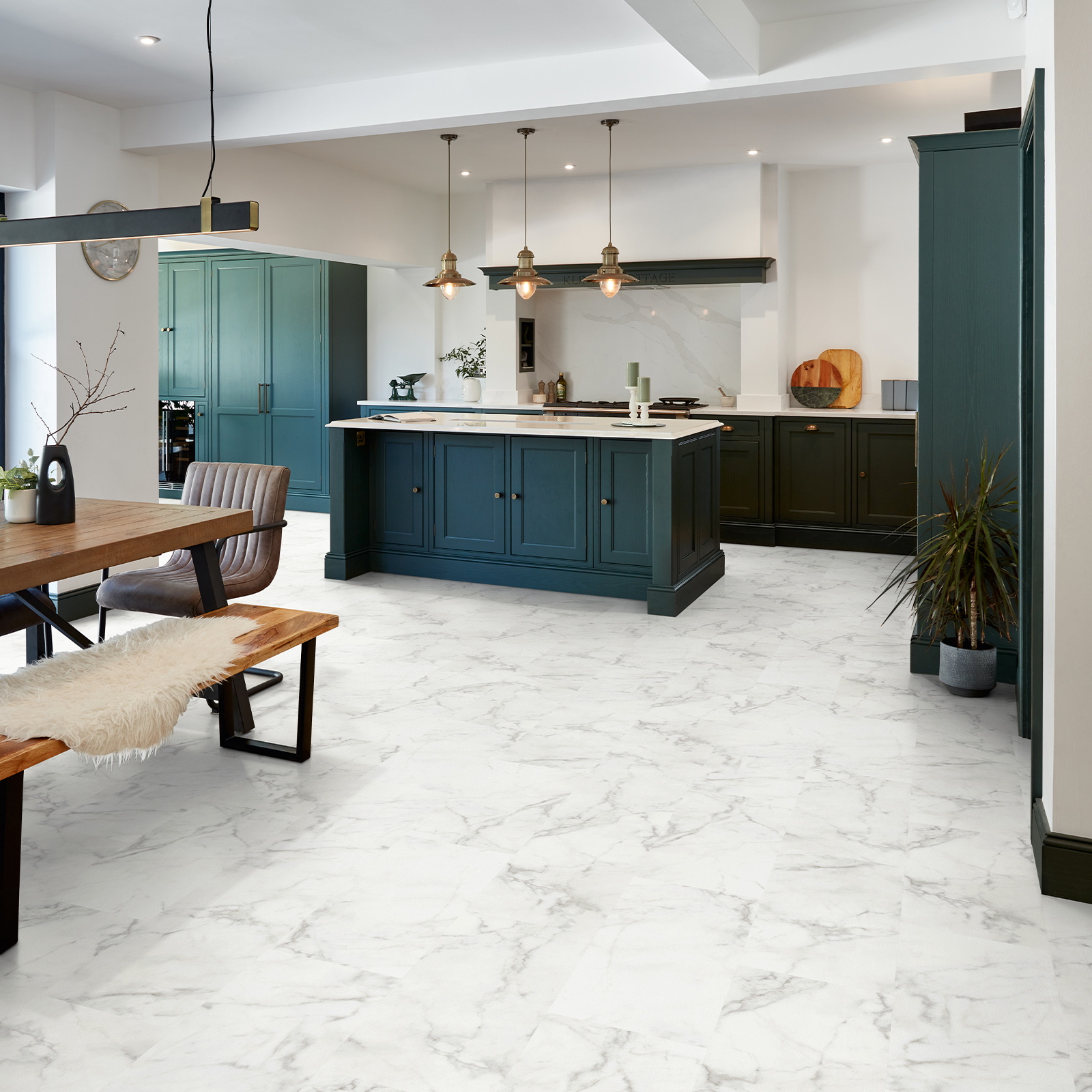 Palio by Karndean Core – Massa RCT6306 offers a beautiful balance of contemporary style and everyday practicality. Massa presents a cool white marble effect with a clean authentic look and characteristic veining in shades of light to mid-grey. A versatile and highly practical floor, Massa brings the classic sophistication of marble to any room, adding character to living spaces, hallways, bedrooms and open areas, bringing a natural sense of elegance to your home.