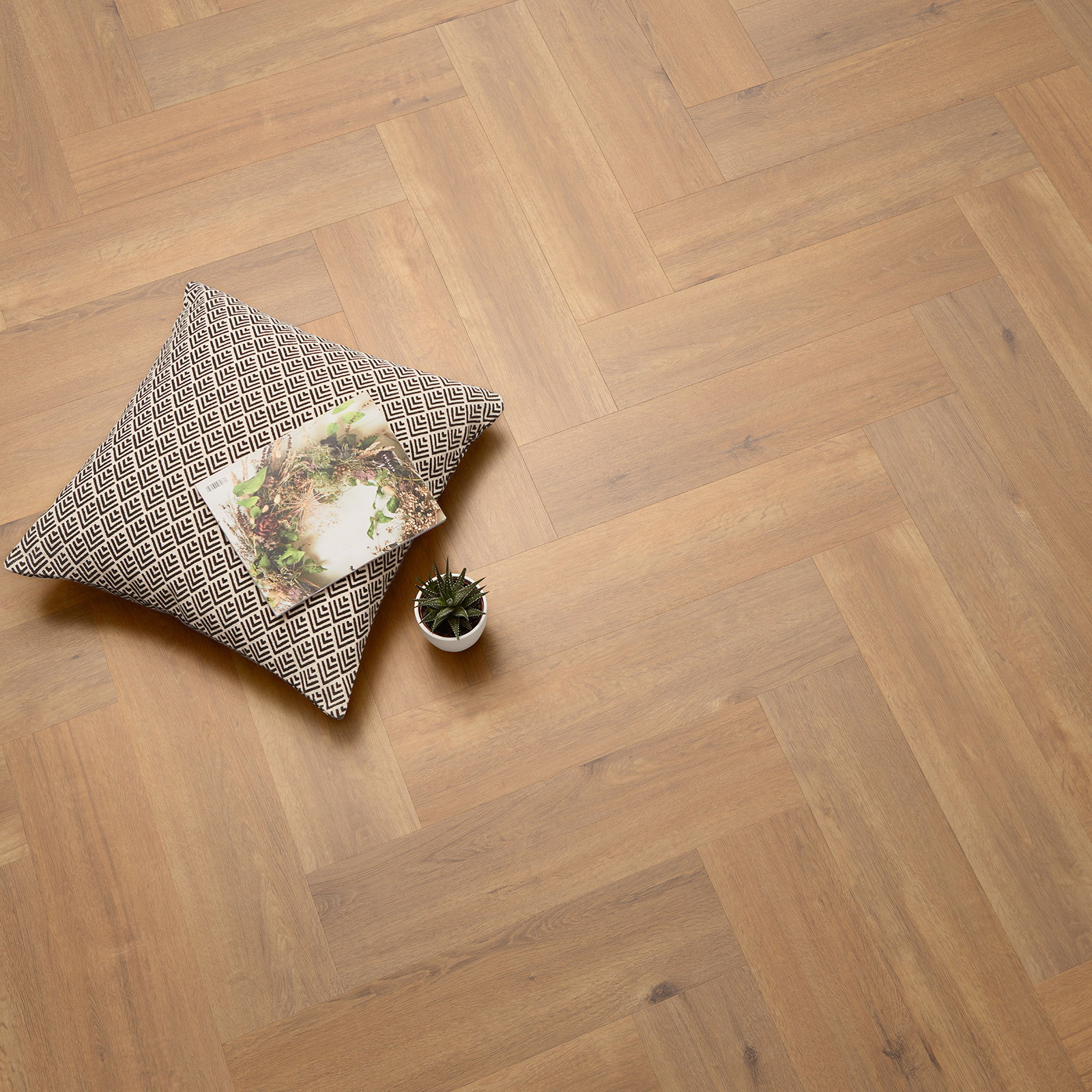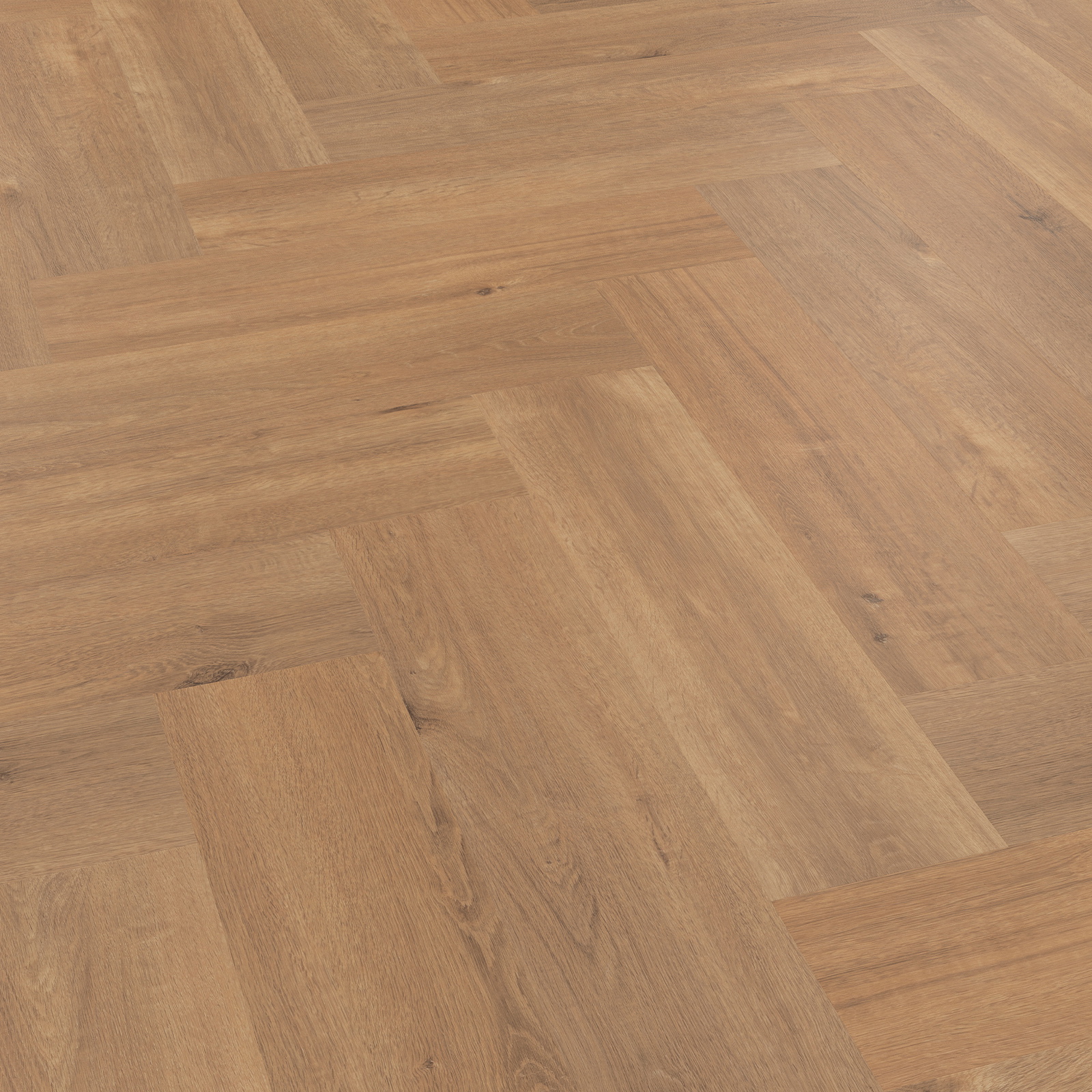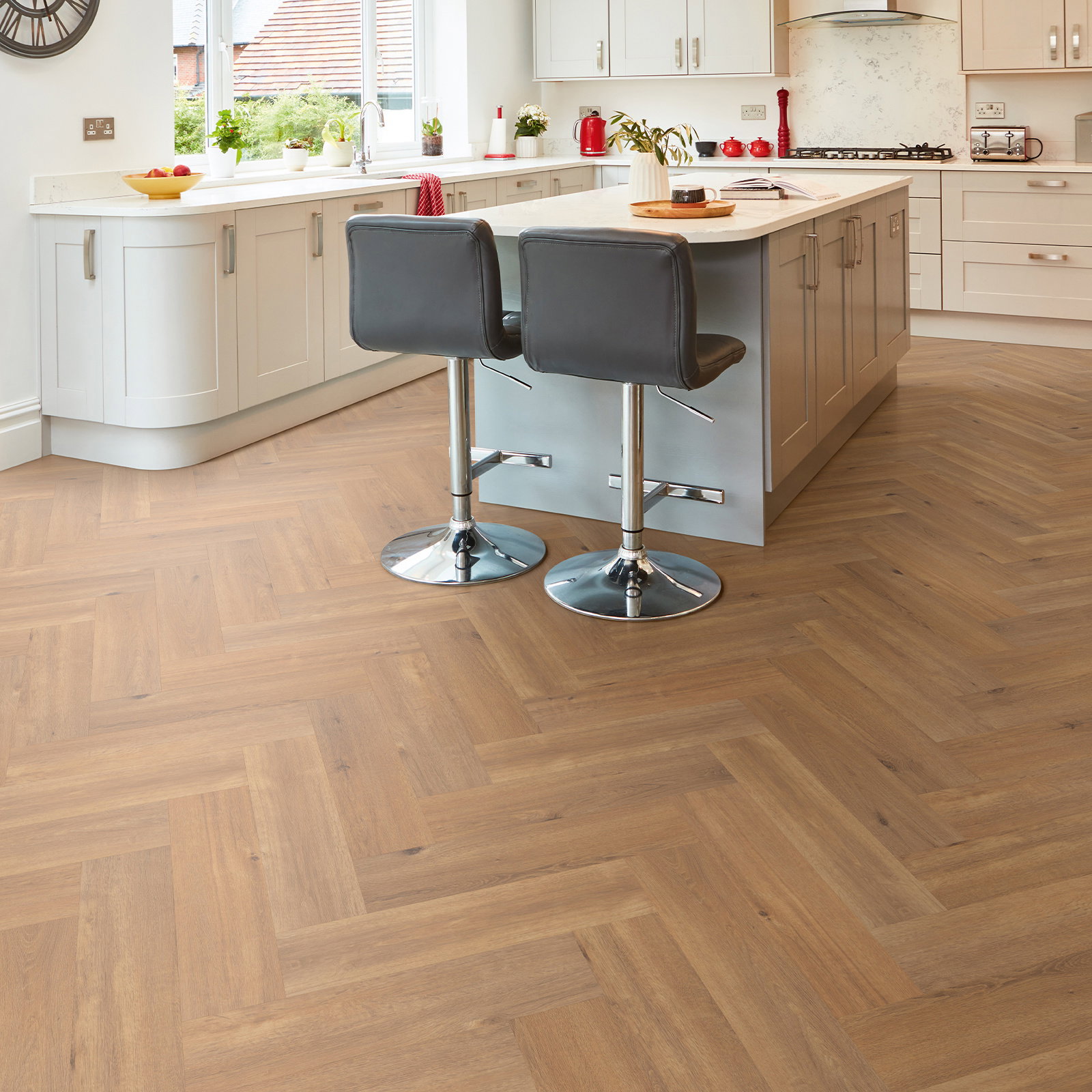 Palio by Karndean Core – Modena SM-RCP6533 offers a beautiful balance of contemporary style and everyday practicality. Modena features the bleached blonde and frosted honey tones of North American oak, enhanced with a light finish to highlight the warm natural colouring. Laid in an on-trend herringbone pattern, the smaller (596mm x 149mm) planks emphasize the wide grain detailing, adding character to living spaces, hallways, bedrooms and open areas, bringing a natural sense of warmth to your home. Modena is also available in a (1220mm x 179mm) full length plank design.