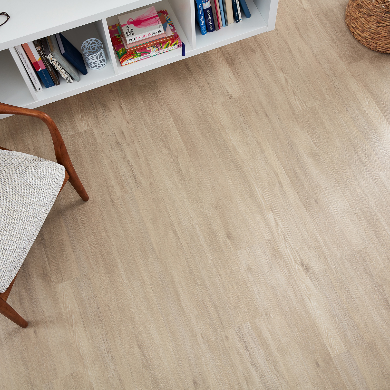 Palio by Karndean Rigid – Lampione PVP147-SCB is a premium rigid core luxury vinyl tile (LVT) that finds a perfect balance between contemporary design and everyday practicality. This stylish floor features a light contemporary aesthetic, combining pale blonde tones with subtle linear grains in a light ash grey, creating a bright and airy look that is suitable for a wide range of interiors. Authentic knotting and grain texture give Lampione a natural wood appearance and add warmth and character to any space, perfect for brightening up a room whilst maintaining a natural feel.