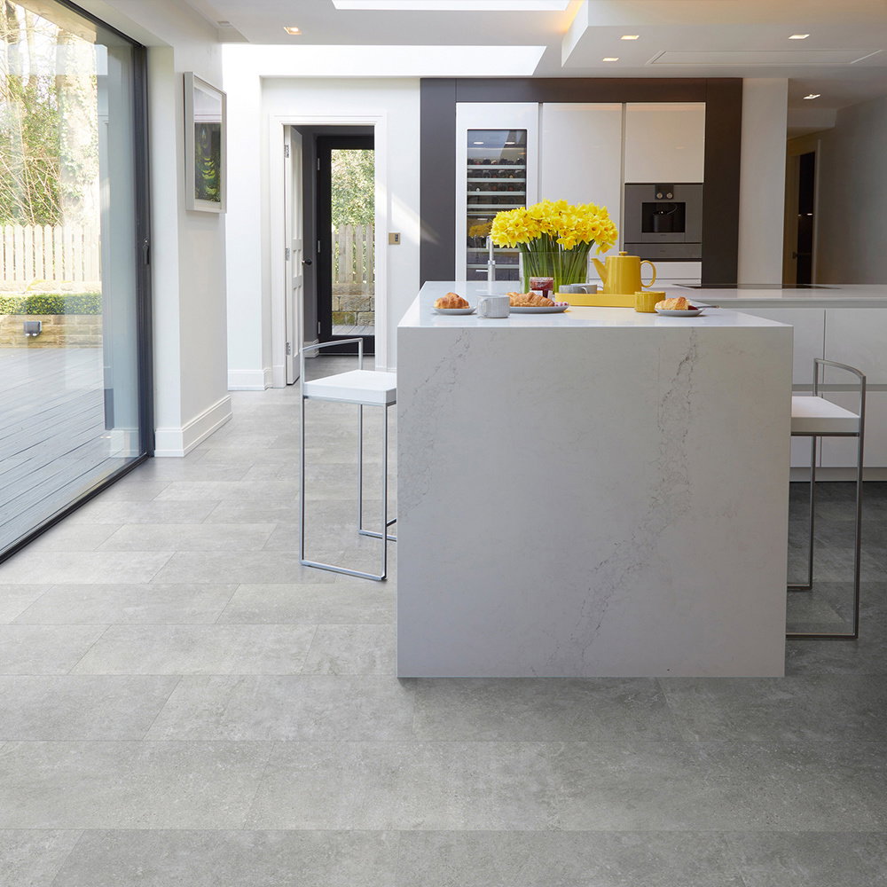 Introducing the Camaro Rigid Core PUR- Tribeca Cement, a stunning luxury interlocking vinyl flooring tile from Polyflor’s SPC collection. This high-design flooring solution is perfect for all home interiors, providing both durability and style.