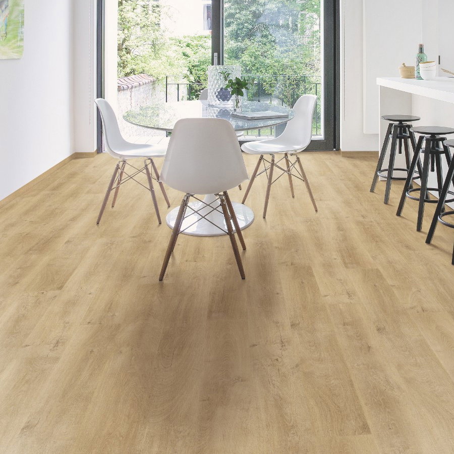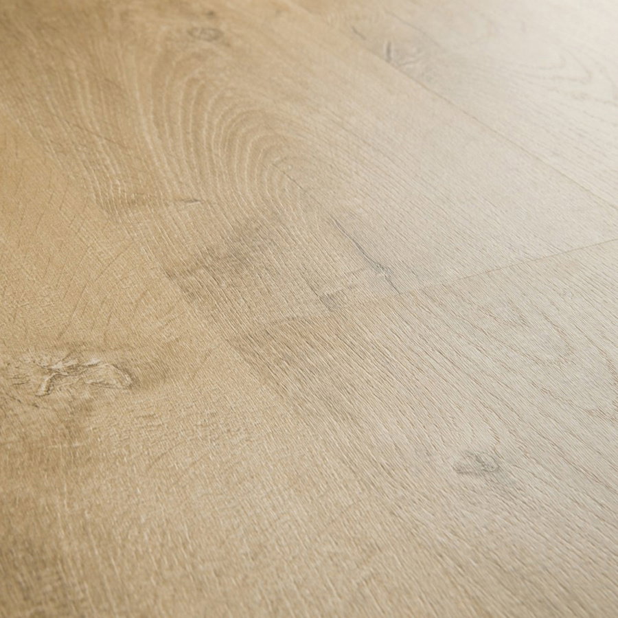 Step into comfort with the Venice Oak Natural EL3908 laminate flooring from Quick-Step. This flooring mimics the natural charm of oak in a lighter, versatile tone that imbues a warm and welcoming vibe to your room.
