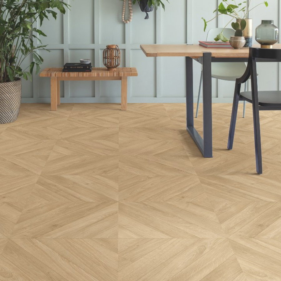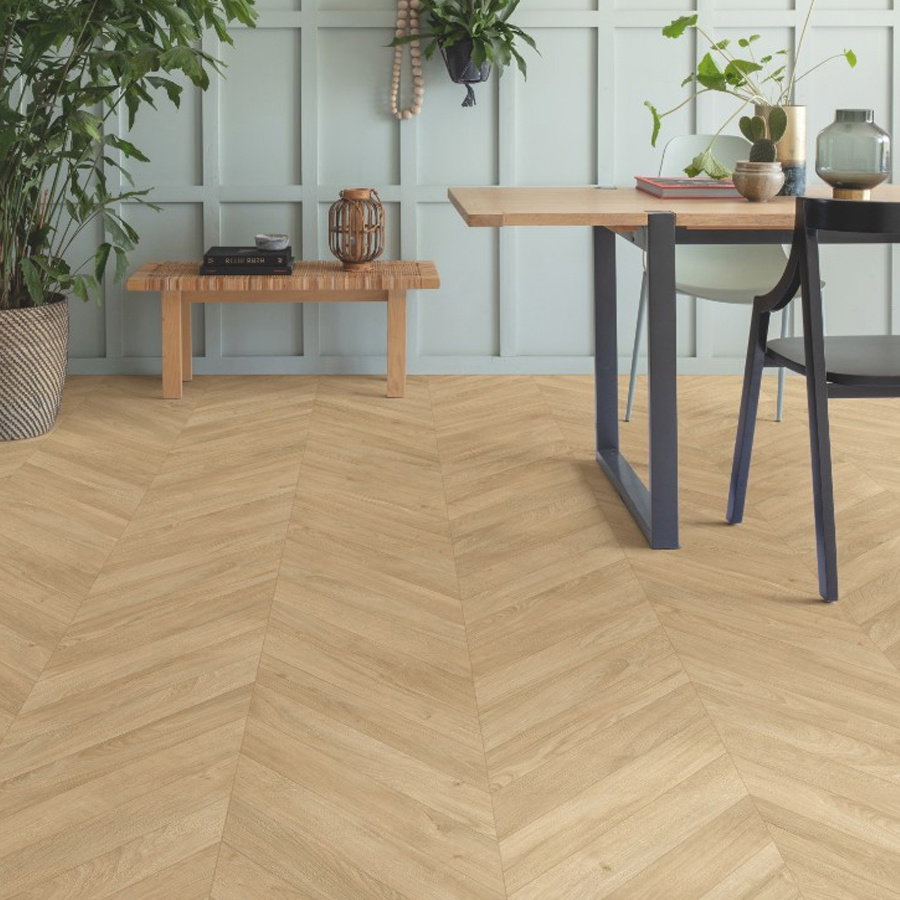 Meet the exquisite Quick-Step Chevron Oak Medium IPA4160 laminate flooring that beautifully captures the natural oak effect. Adding a warm, organic touch to your interiors, this flooring solution is designed to be long-lasting and waterproof, making it an ideal choice for any room, including moisture-prone areas like kitchen and bathrooms. The wide planks are crafted with a click installation mechanism that neatly locks into place, enhancing the smoothness of the setting process.