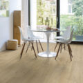 Introduce your home to the tasteful styling of the Quick-Step Impressive – Soft Oak Medium IM1856, a Quick-Step Laminate Flooring that beautifully imitates the effect of natural wood, with a charming light oak colour. This flooring isn’t just pretty to look at, it’s built to last too. Constructed with a hard-wearing, AC4 wear class, this laminate can easily resist everyday wear and tear. What’s more, it’s perfectly at home in all areas of your house, be it the kitchen, living room, or even the bathroom – thanks to its waterproof design that resists water infiltration.