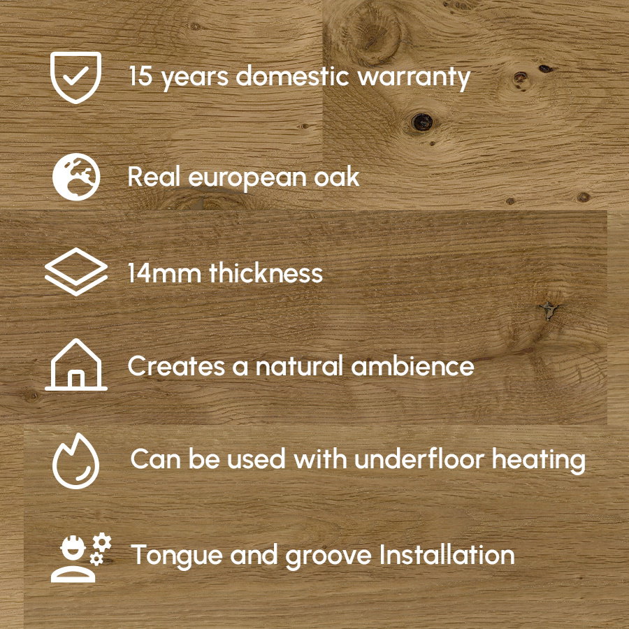 Suitable for underfloor heating, the Royal 14x150mm Engineered Oak allows for a seamless blend of style and comfort, ensuring your space remains warm and inviting without compromising on design. Although not waterproof, its robust construction and finish make it suitable for a wide variety of settings, except those prone to moisture exposure.