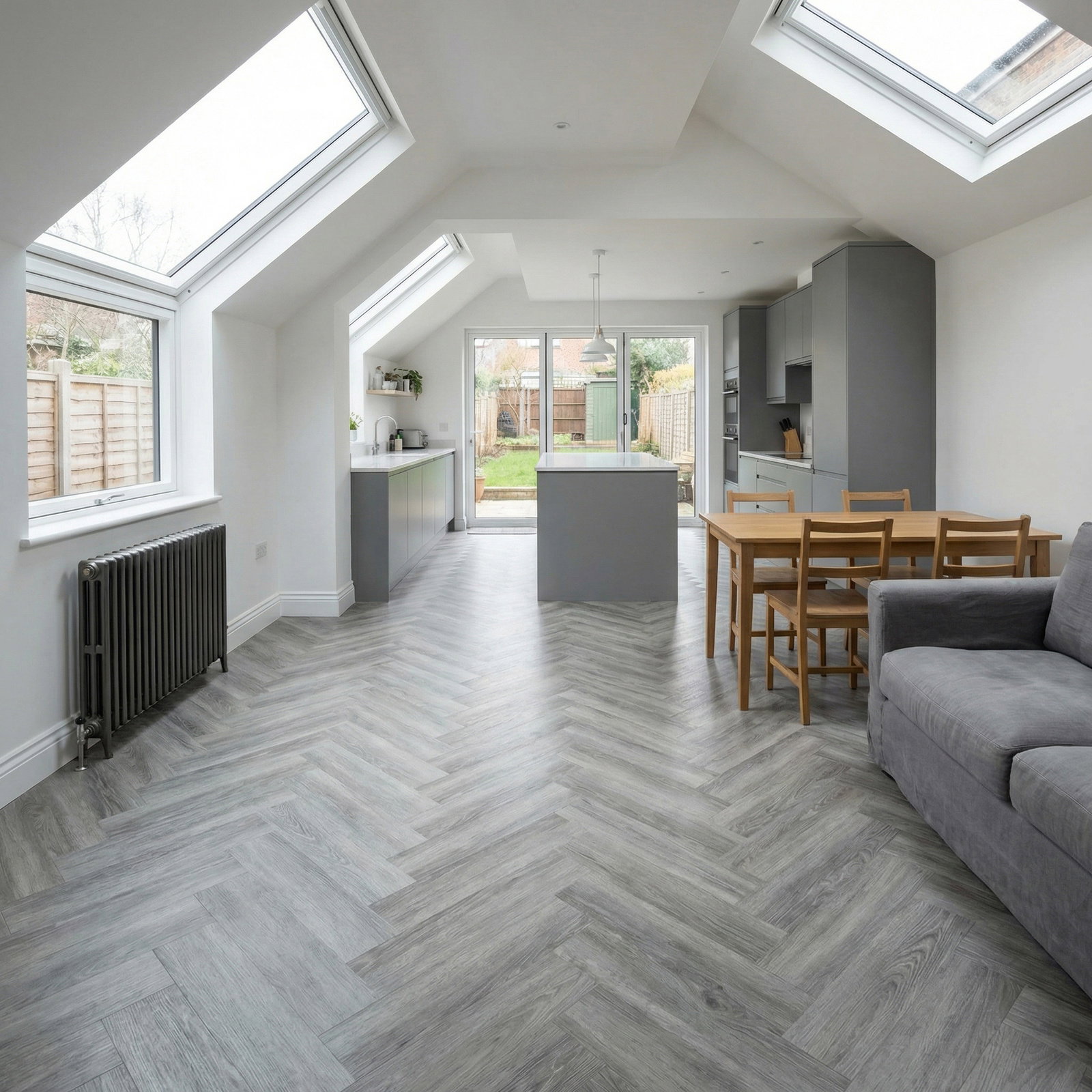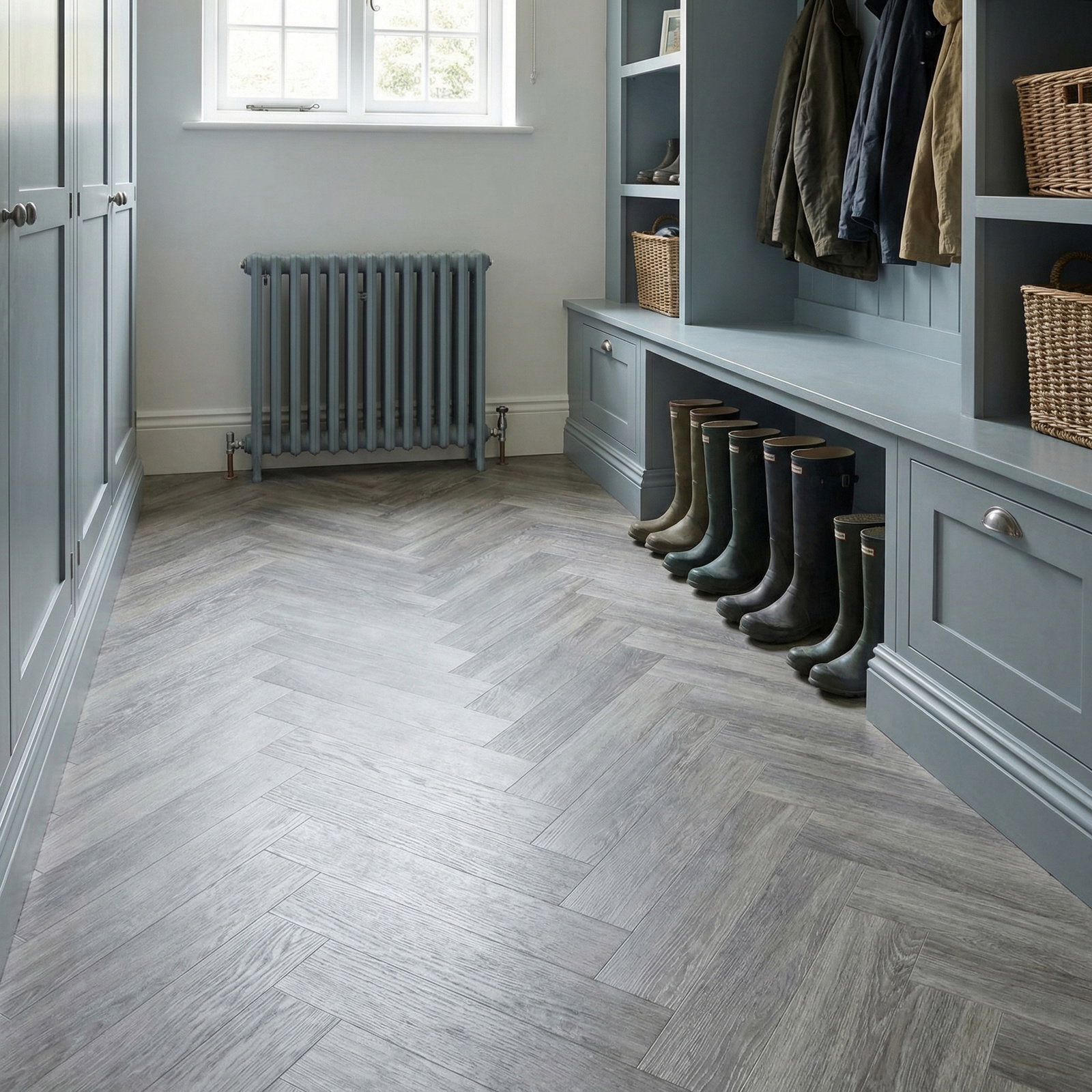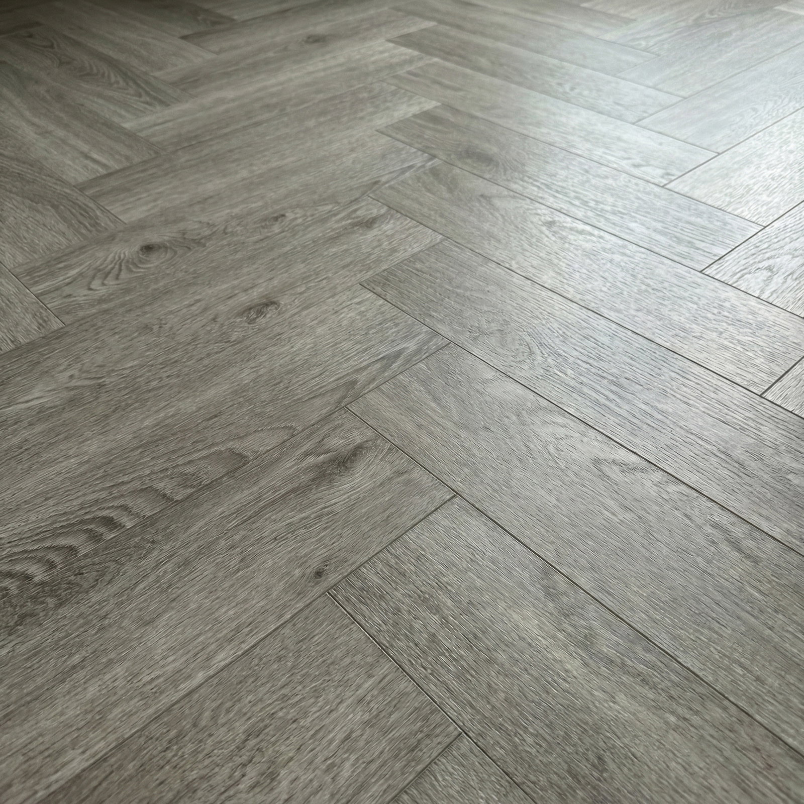 In summary, the Royal Click Pro Herringbone Thunderstorm Grey LVT flooring offers a perfect blend of contemporary elegance and practicality, ideal for those who value a stylish, robust, and easy-to-maintain flooring solution with a distinct aesthetic appeal.