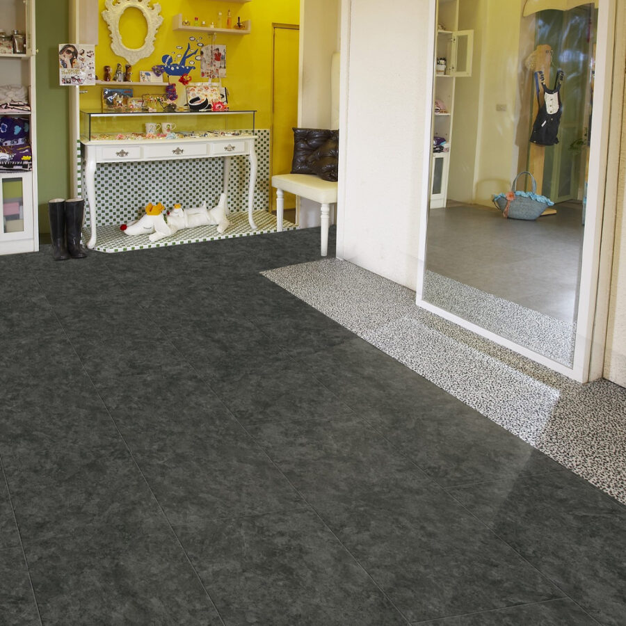 In summary, the Royal Click Pro Tile Graphite Stone LVT flooring is an excellent choice for those seeking a floor that combines the dramatic allure of stone with the practicality of modern technology, offering a durable, stylish, and easy-to-maintain solution.