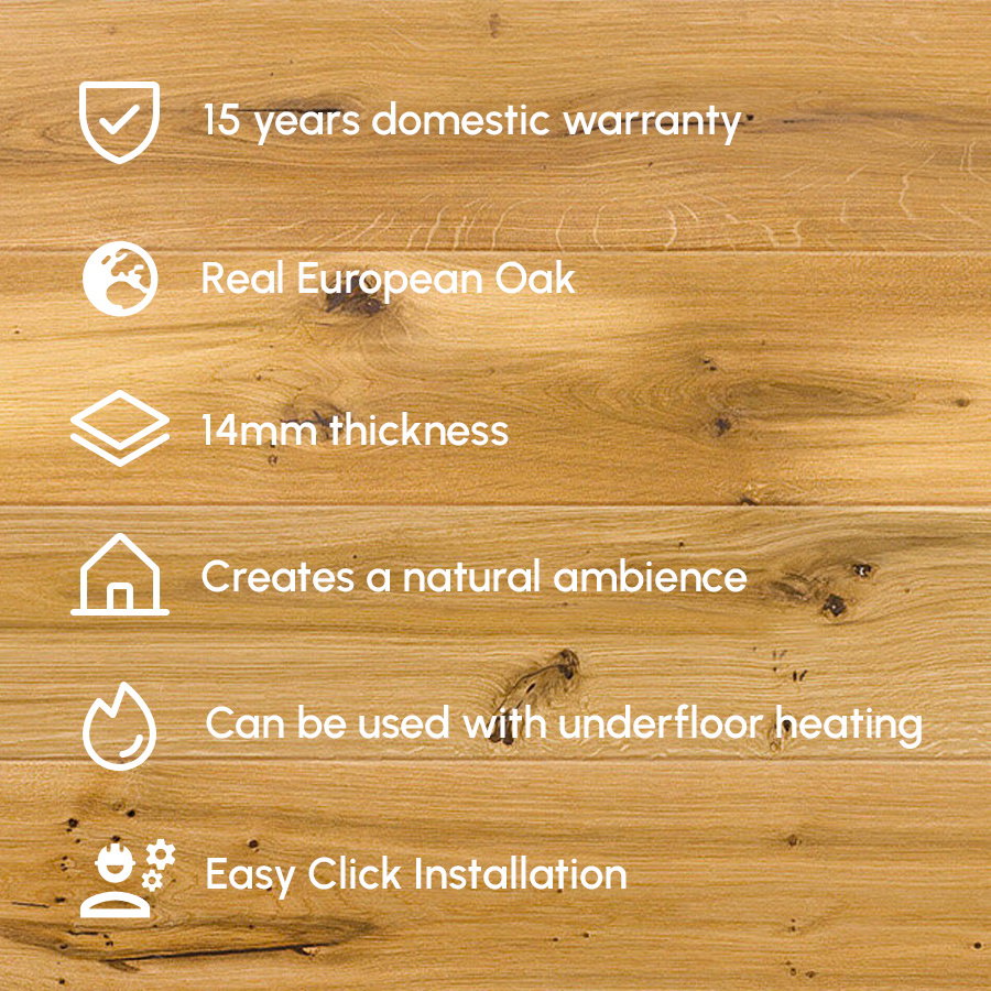 Compatible with underfloor heating systems, the Timba Floor 5G Engineered Oak combines the aesthetic appeal of oak with the practical advantage of modern heating, ensuring your space remains warm and welcoming. While not waterproof, its solid construction and finish make it a suitable choice for various indoor environments, adding an element of warmth and style to your home.