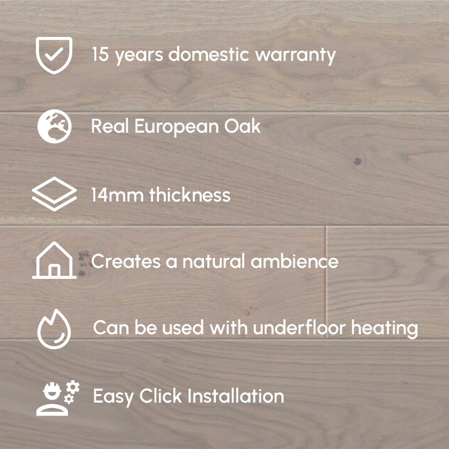 Designed to meet the needs of modern living, this flooring is compatible with underfloor heating systems, merging the aesthetic beauty of grey oak with the functional benefits of warmth and comfort. Although not waterproof, its sturdy construction and finish make it suitable for a wide range of indoor environments, adding a layer of elegance and warmth to your home.