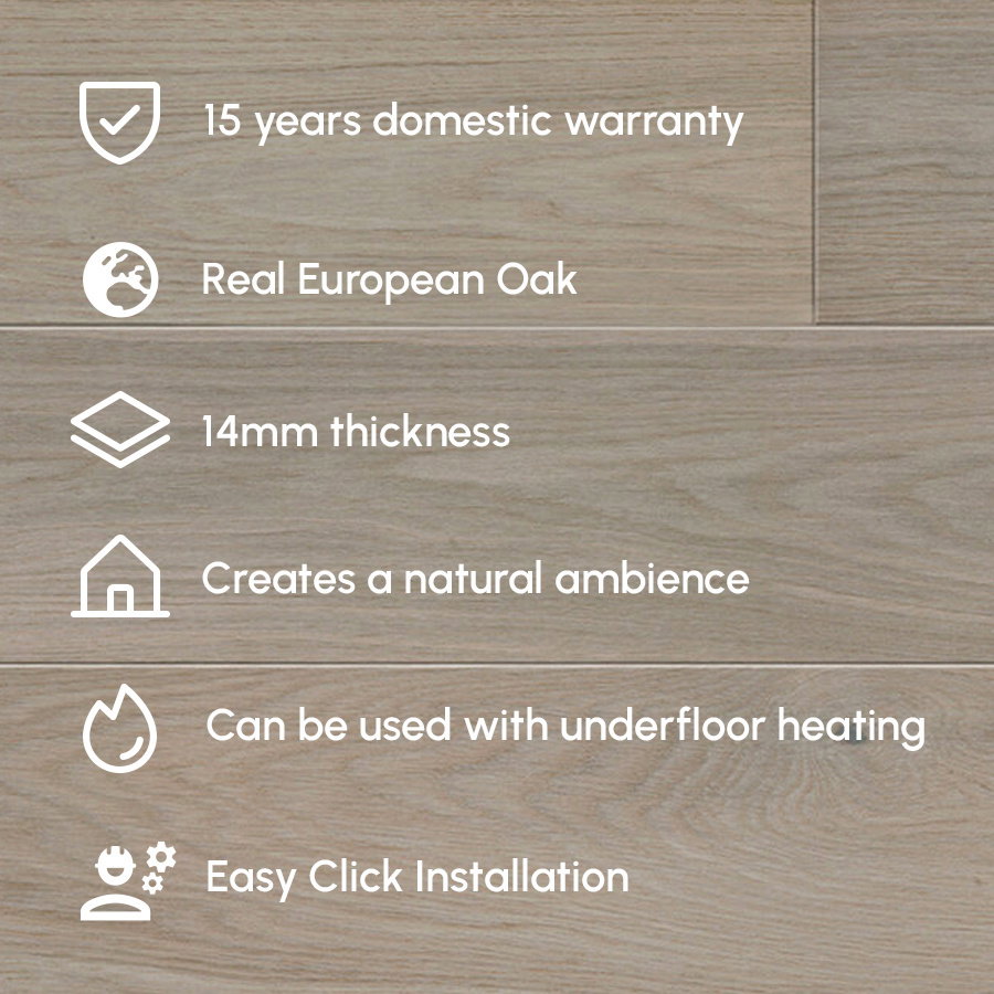With a 2.5mm wear layer, this engineered oak flooring is built to last, offering robust protection against scratches and scuffs. The inclusion of a 15-year warranty further underscores its durability and quality, ensuring that your flooring investment is secure and will continue to enhance the beauty of your home for years to come.