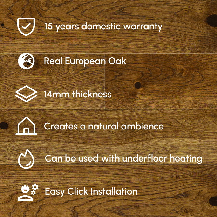 Compatible with underfloor heating, this flooring combines the visual appeal of dark smoked oak with the practical benefits of modern heating technology, ensuring your space remains warm and inviting. Although not waterproof, its solid construction and finish render it suitable for a wide range of indoor environments, adding a touch of elegance and sophistication to your home.