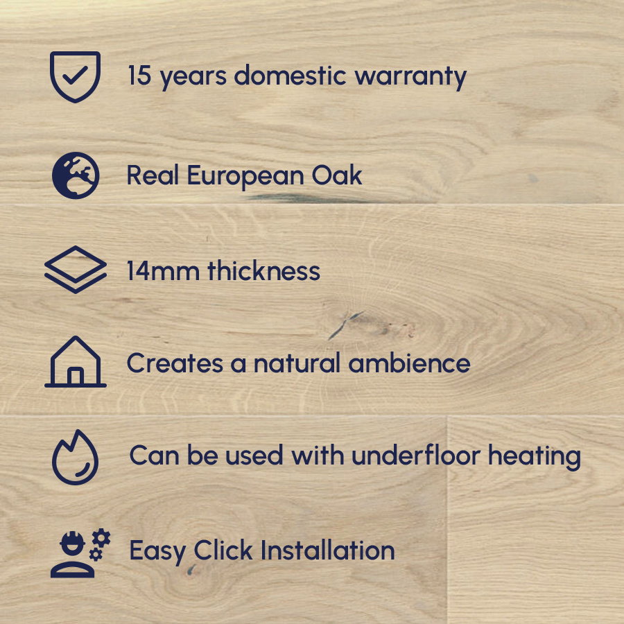 Designed to complement modern homes, this flooring is compatible with underfloor heating systems, merging the aesthetic appeal of light oak with the practical benefits of warmth and comfort. Although not waterproof, its solid construction and finish make it suitable for a broad range of indoor environments, enriching your home with both style and practicality.