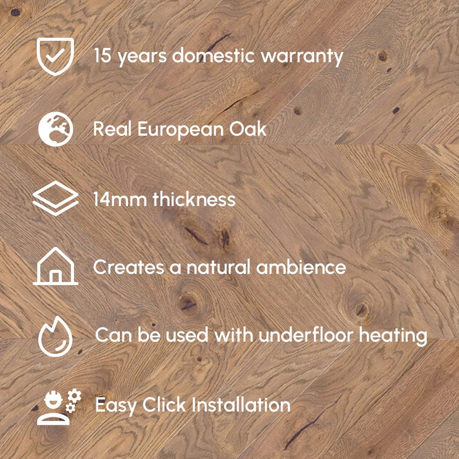 Crafted with meticulous attention to detail, the Timba Floor Chevron range epitomises quality and aesthetic appeal. Each plank is carefully constructed using the tongue & groove installation method, known for its precision and reliability, offering a seamless and secure fit. With plank dimensions of 14mm x 130mm x 725mm, the engineered oak not only presents a classic chevron pattern but also adds depth and character to your flooring. The bevelled edging further accentuates each plank, creating a subtle yet distinctive definition that enhances the chevron effect, imbuing your floors with a sense of sophistication and elegance.