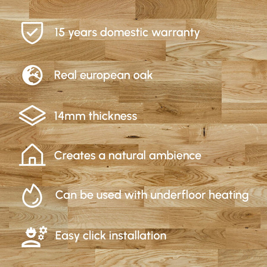 Designed to complement modern living, this flooring is compatible with underfloor heating systems, combining the timeless elegance of oak with the practical benefits of warmth and comfort. Although not waterproof, its solid construction and finish make it an excellent option for a variety of indoor environments, adding a layer of sophistication and warmth to your home.