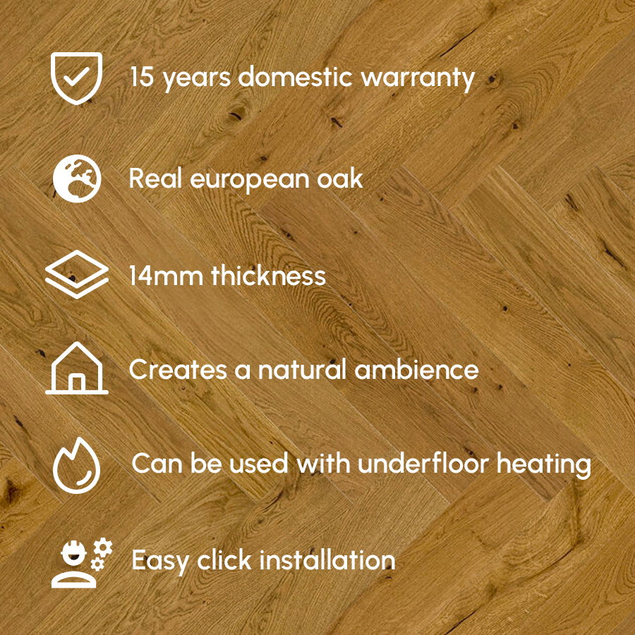 Each plank is carefully crafted with bevelled edging, enhancing the intricate herringbone pattern and adding depth and character to your floors. The 2.5mm wear layer atop the engineered oak provides robust protection against daily wear and tear, ensuring your floor maintains its stunning appearance under high foot traffic. Supported by a 15-year warranty, this flooring is a testament to its quality and durability.